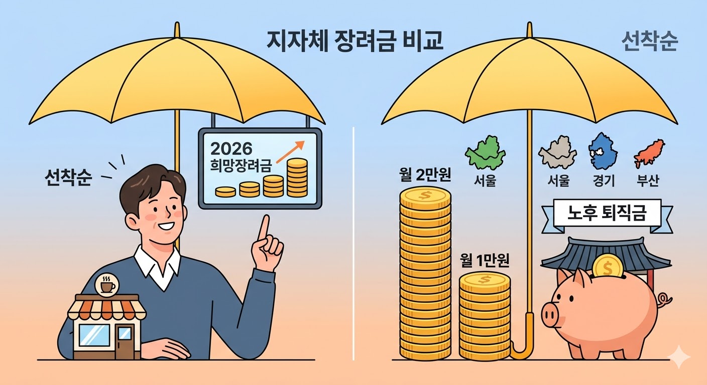 노란우산공제에 가입하면 정부 이자 외에, 각 지자체(서울, 경기, 부산 등)에서 매달 1~2만 원씩 1년간 공짜 돈을 얹어줍니다. 2026년에는 이 예산이 늘어나 신규 가입자뿐만 아니라 기존 가입자 중 특정 조건(매출 하락 등)을 충족하는 분들에게도 추가 장려금을 지급하는 지자체가 늘어났습니다.